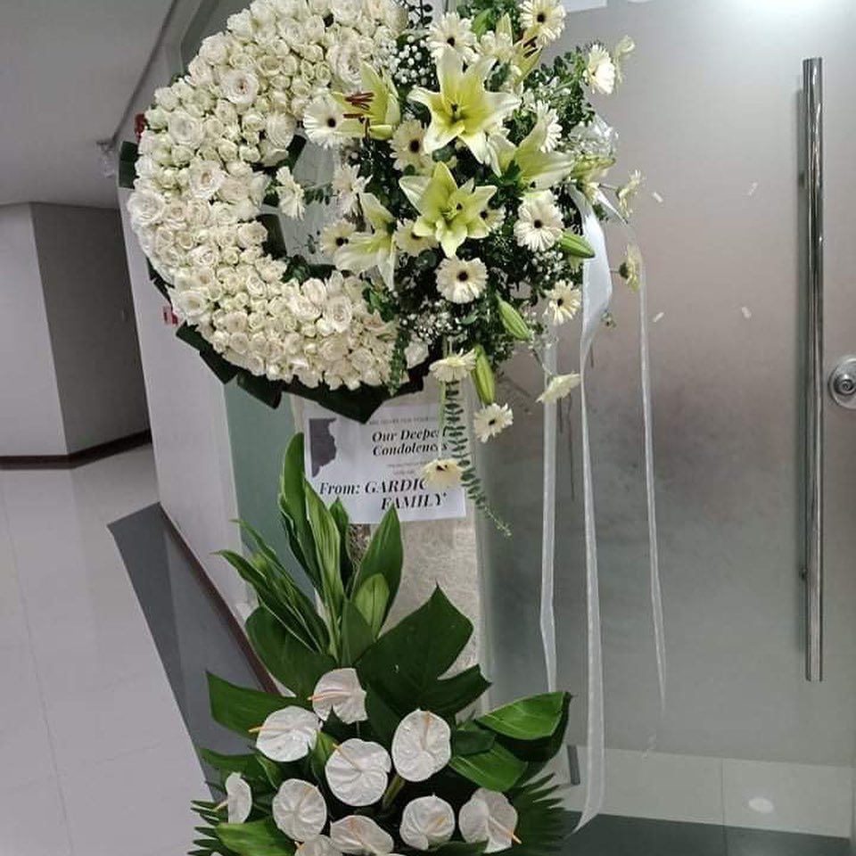 A Radiance Rose white funeral WreathThis bright sympathy wreath features an array of high quality vivid flowers such as: exotic lilies, exquisite roses, freshly picked seasonal blooms, and accents of lush greenery. Send it to the home of the bereaved family as an expression of your deepest sympathies, or to the funeral home for the memorial service and viewing. |